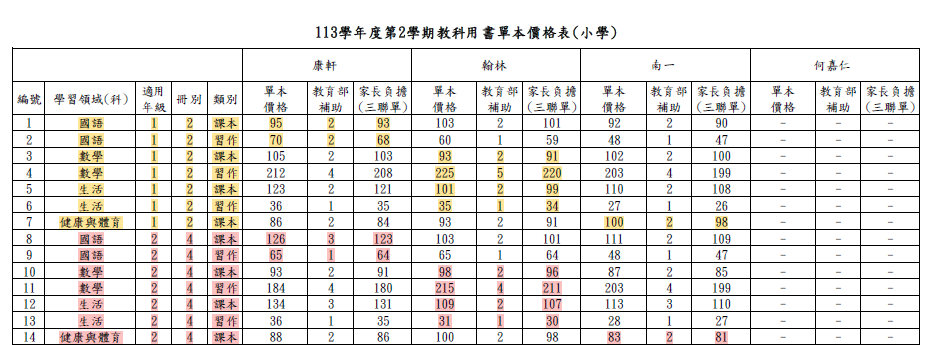 本校113學年度第二學期教科書版本和價目表如下: