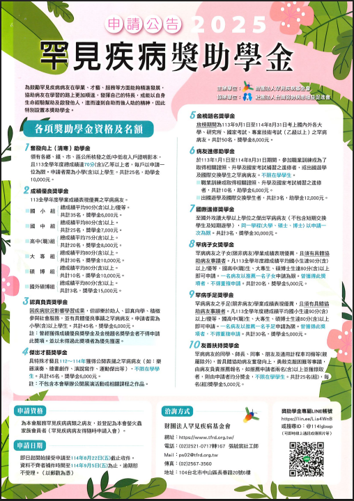 | 一、 | 依據財團法人罕見疾病基金會114年6月5日罕病社字第1140750037號函辦理。 |