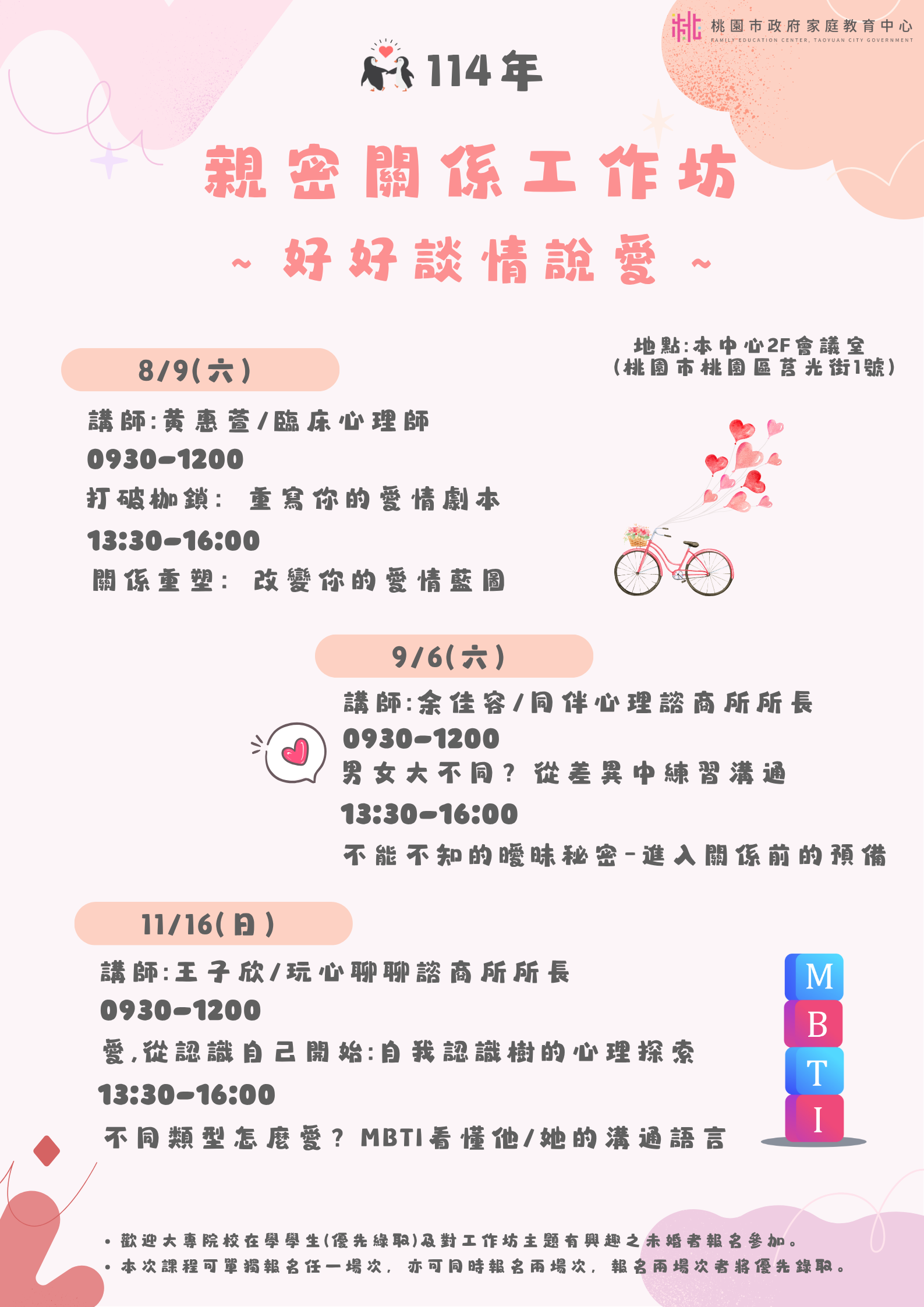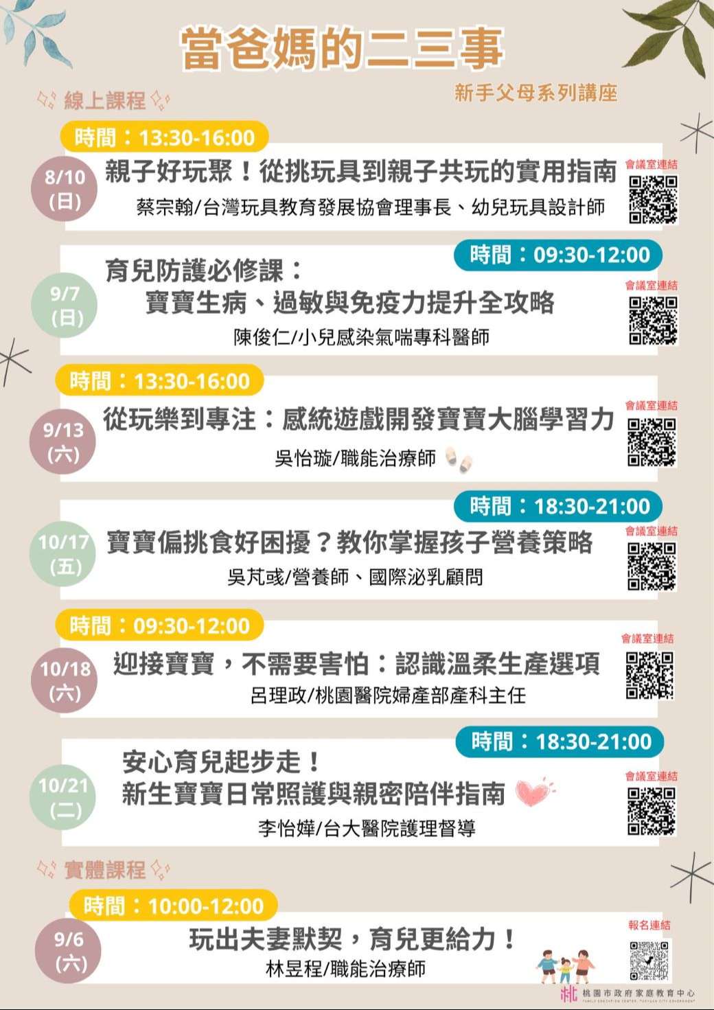 | 二、 | 旨揭課程詳細資訊,請見中心課程行事曆(https://reurl.cc/xlGyGL)或追蹤「桃園市政府家庭教育中心」FB粉絲專頁;另倘有家庭教育個別化服務需求,可撥打4128185家庭教育諮詢專線,本市市民可申請小桃家線上諮詢室(預約連結:https://reurl.cc/oZWOY5),由中心媒合專業人員透過線上會議室提供服務。 |