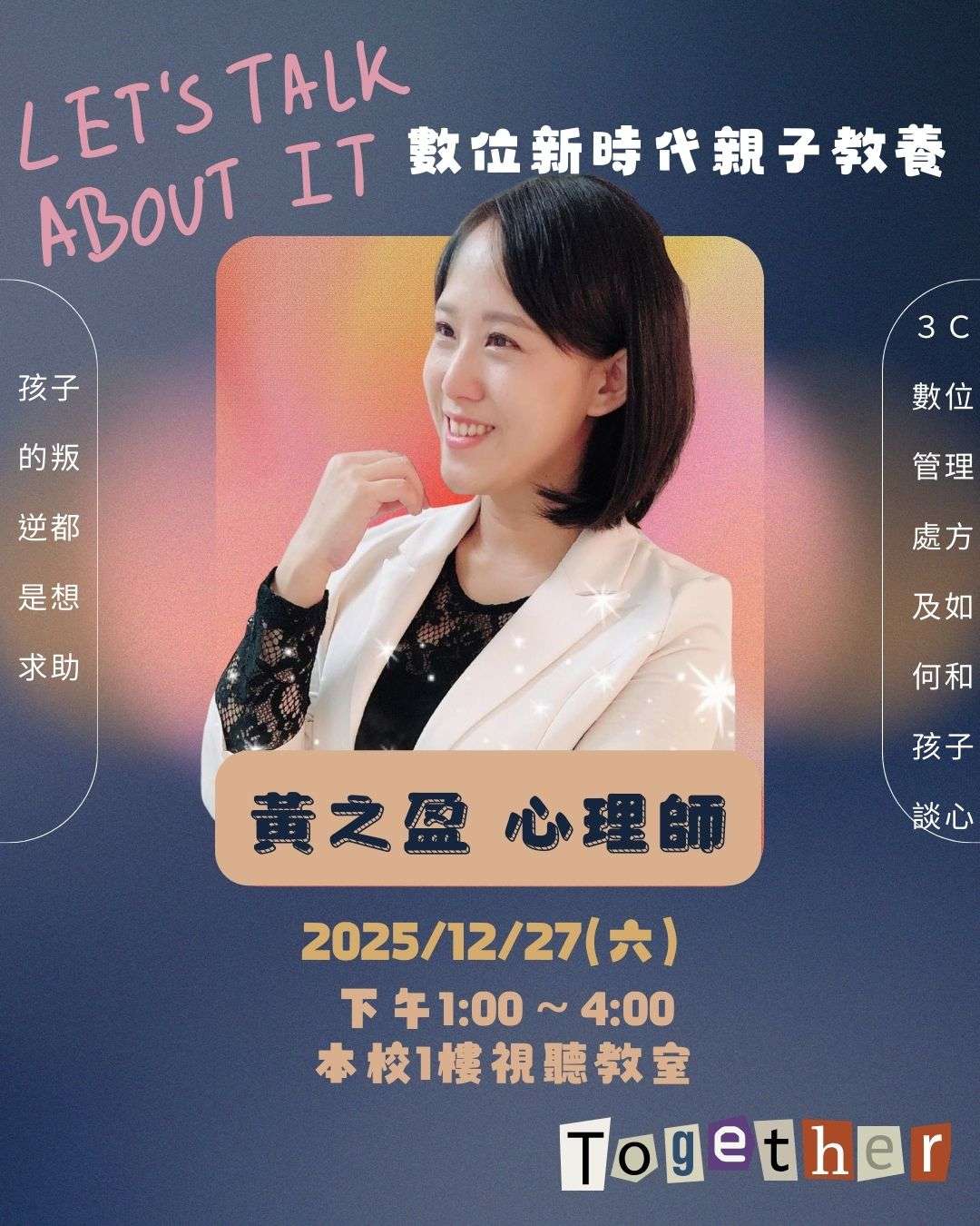 | (四) | 主題:數位新時代親子教養─孩子的叛逆,都是想求助。 |